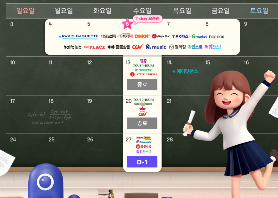 | [sk텔레콤] 이 달의 Day1 혜택11월 13일 (수) (7) | 2024.11.13 |