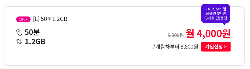 엘지유플러스 망을 이용하며 음성 50분, 데이터 1.2GB를 제공하는 요금제인데요.