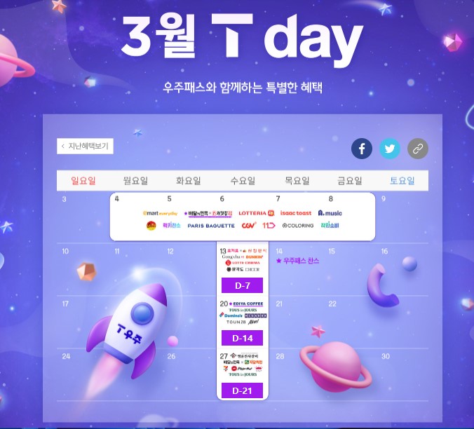 | [SK텔레콤]T데이 Day2 혜택 2월 21일(수)COMING SOON (6) | 2024.02.19 |