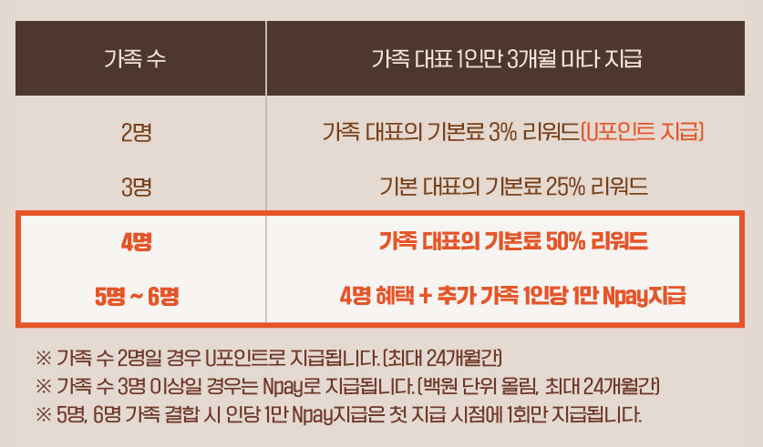 4명 가족대표의 기본료 50% , 4명이상의 경우 5,6명시 1만 Npay를 지급한다고 하네요.